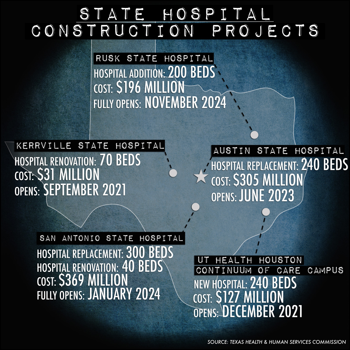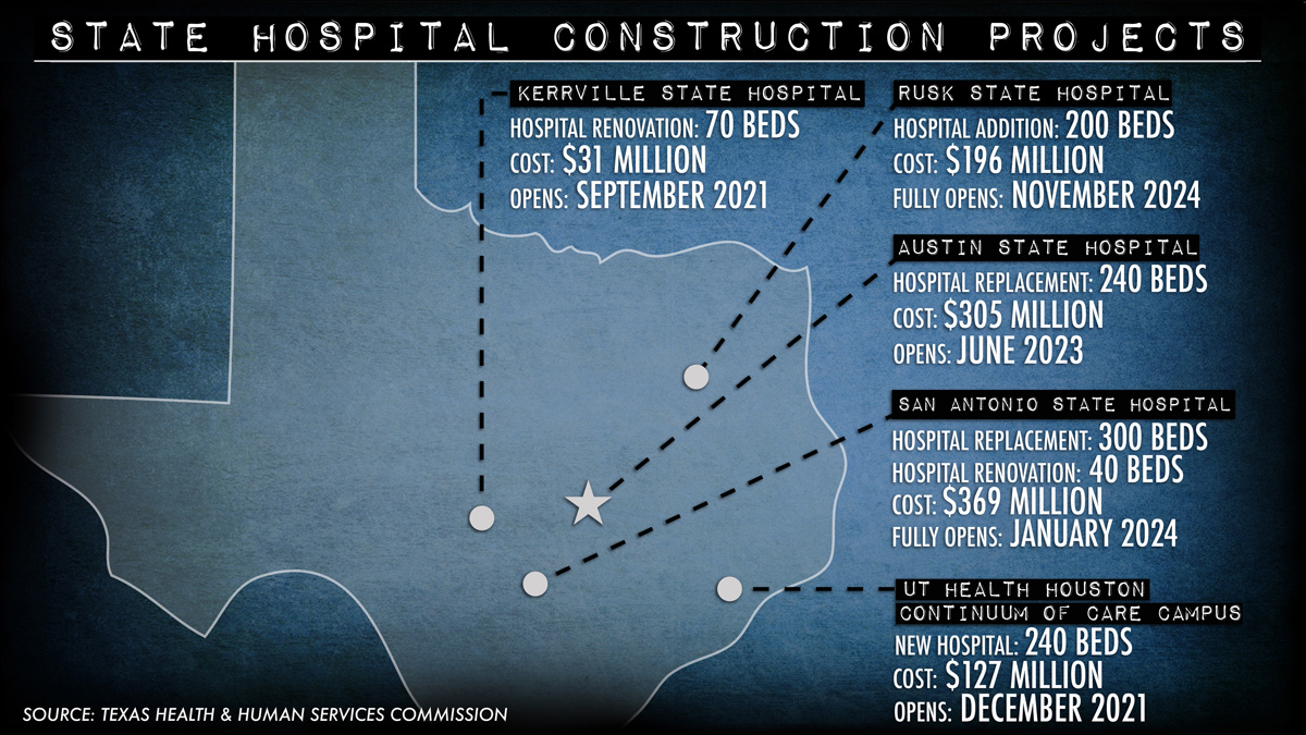 Improvements already underway include adding maximum-security beds to Kerrville State Hospital, replacing 240 beds at Austin State Hospital, and building a new 240-bed hospital at the UT Health campus in Houston for short-term stays, according to HHSC.