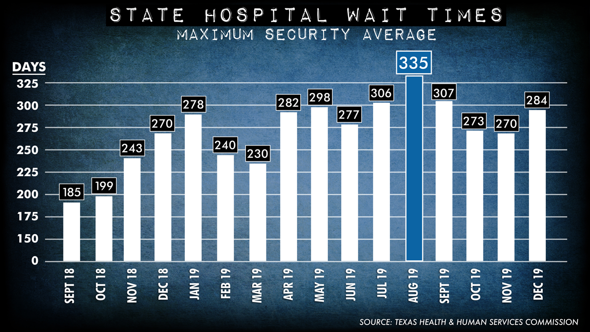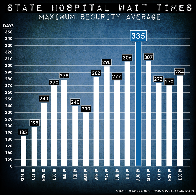 The average number of maximum security inmates in Texas' county jails waiting for state hospital beds never dropped below 230 days in 2019, peaking in August with 335 days.