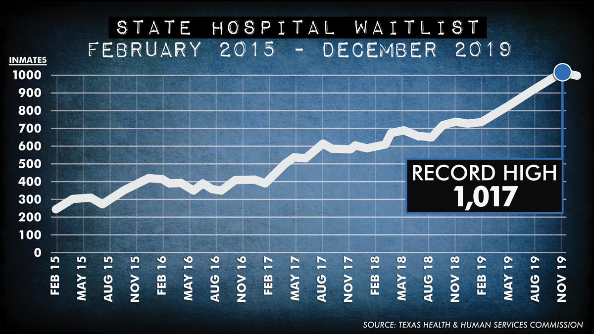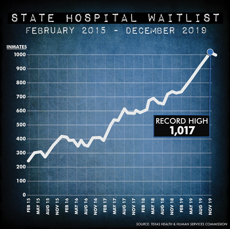 The number of Texas inmates waiting for state hospital beds steadily rose from just over 200 in February 2015 to a record 1,017 in November 2019.